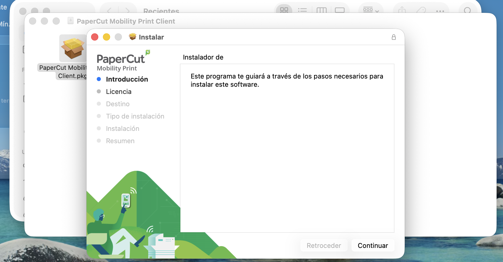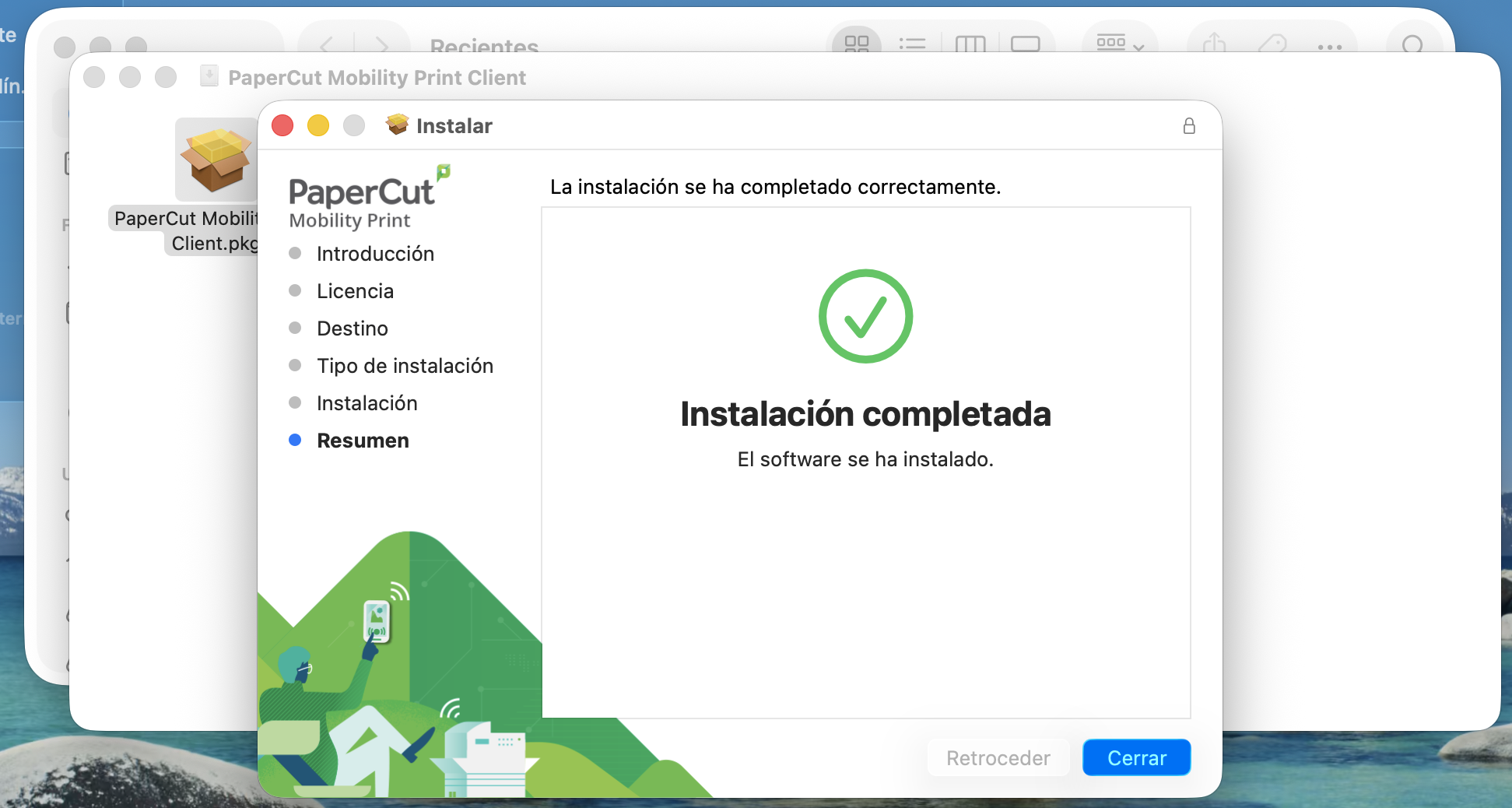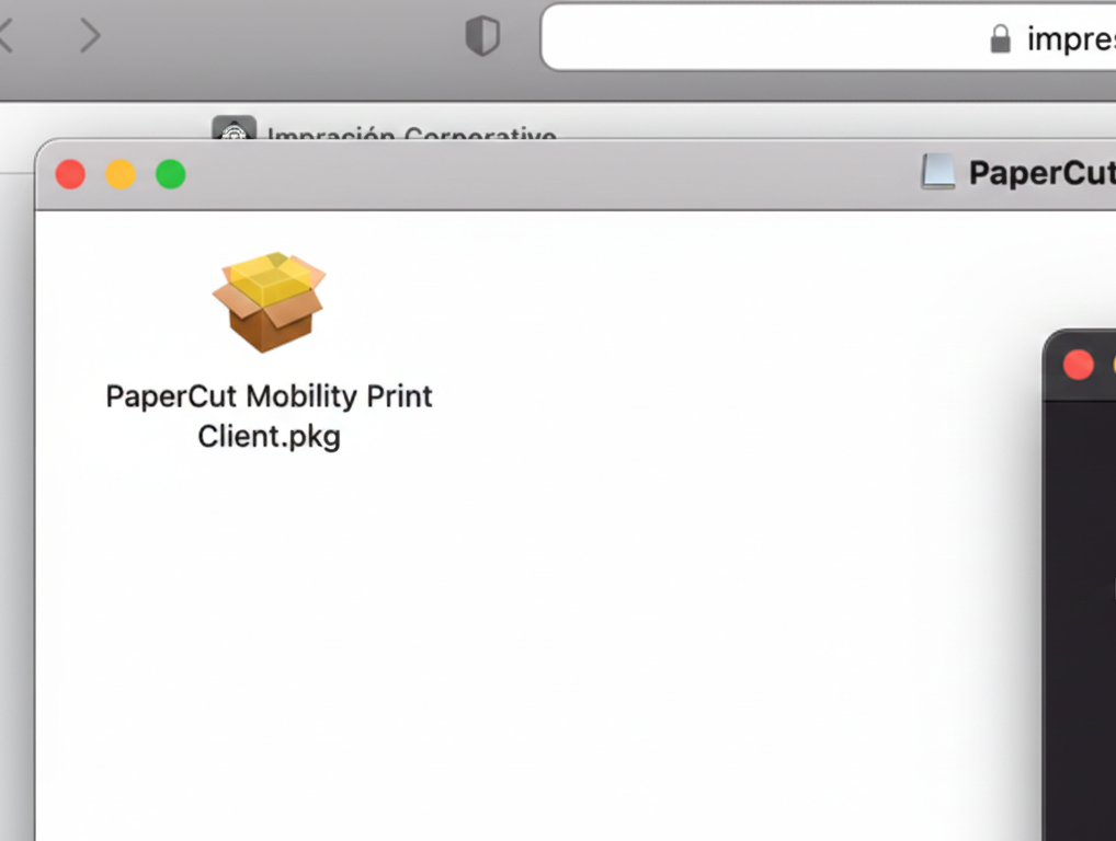 - Una vez descargado el instalador, pulsa en el icono de descargas, abajo junto a la papelera y selecciónalo. En la ventana que aparecerá, ejecuta el instalador PaperCut Mobility Print Client.pkg.