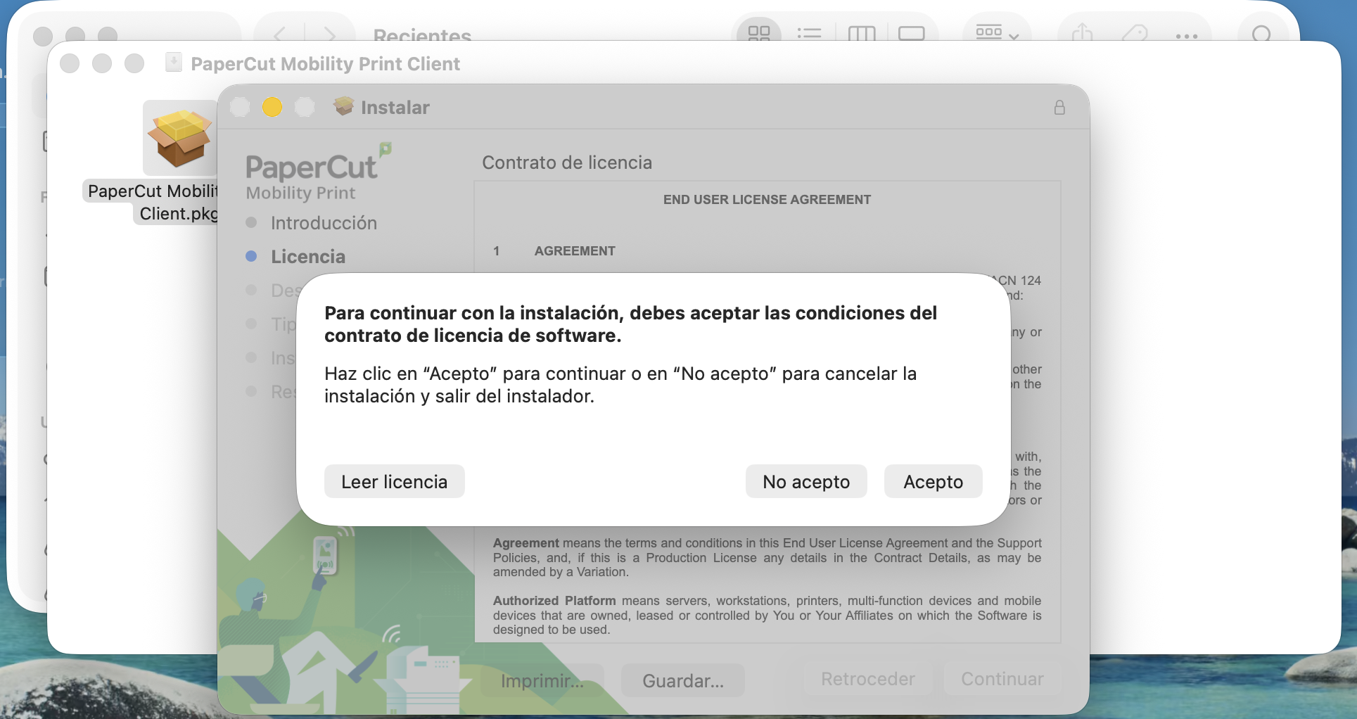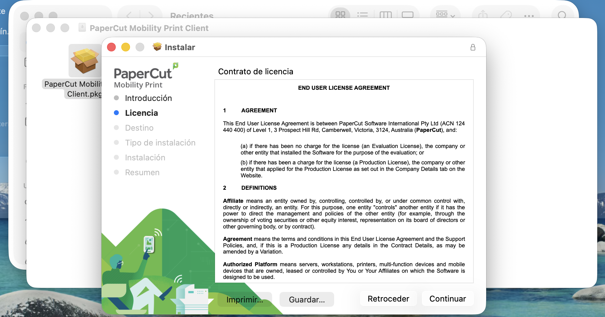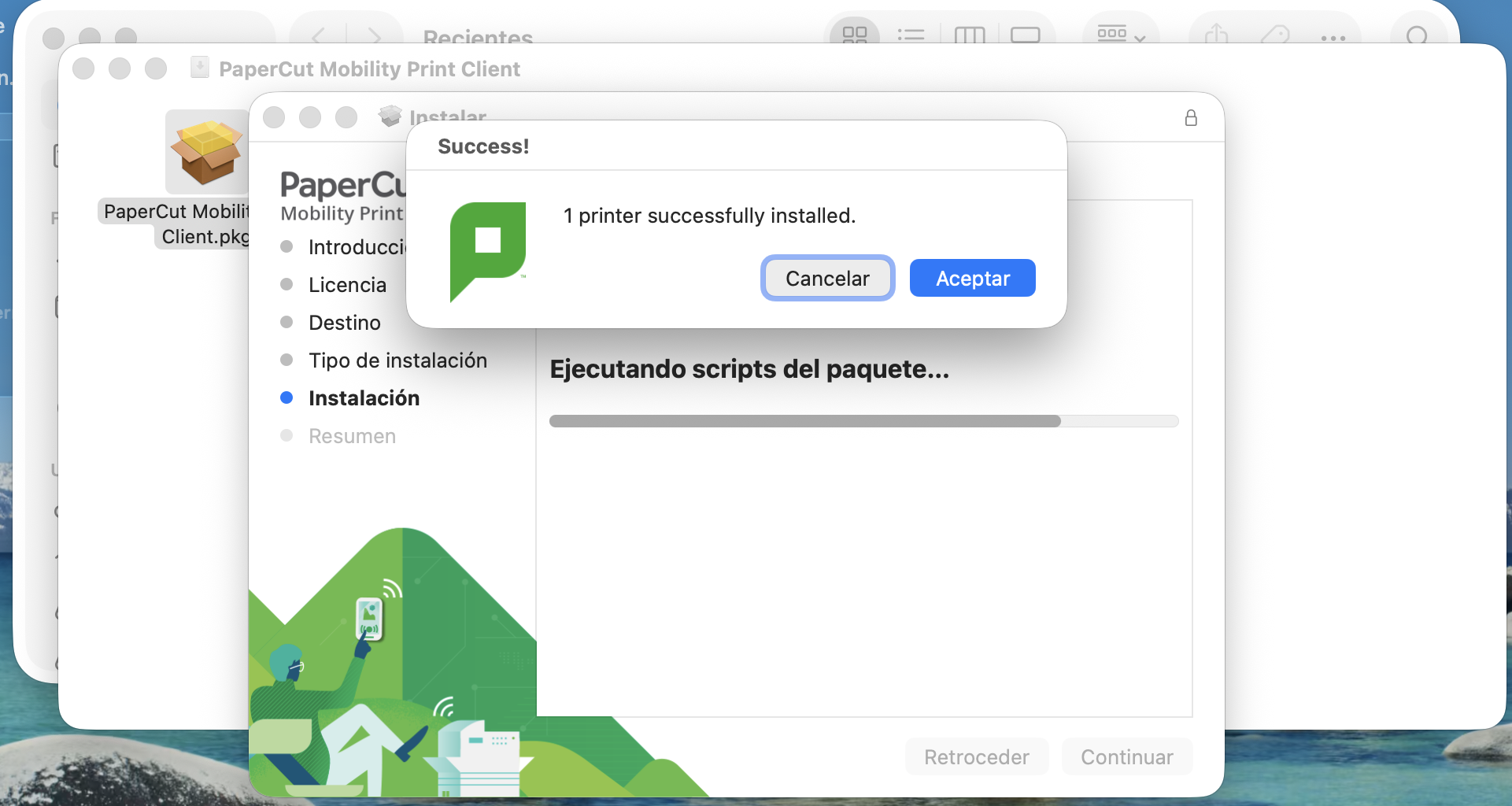 - Una vez descargado el instalador, pulsa en el icono de descargas, abajo junto a la papelera y selecciónalo. En la ventana que aparecerá, ejecuta el instalador PaperCut Mobility Print Client.pkg.