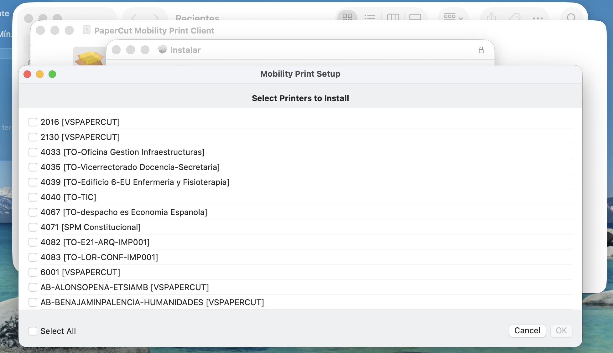 - Ahora, a diferencia de versiones anteriores, el instalador obtendrá la lista de impresoras disponibles y las mostrará. En la lista, selecciona sólo aquellas colas de impresión virtuales correspondientes a los centros o edificios donde te encuentres habitualmente. En caso de que en el futuro necesites incorporar más impresoras a tu equipo, simplemente ejecuta otra vez el instalador y seleccionar las nuevas impresoras que desees añadir.