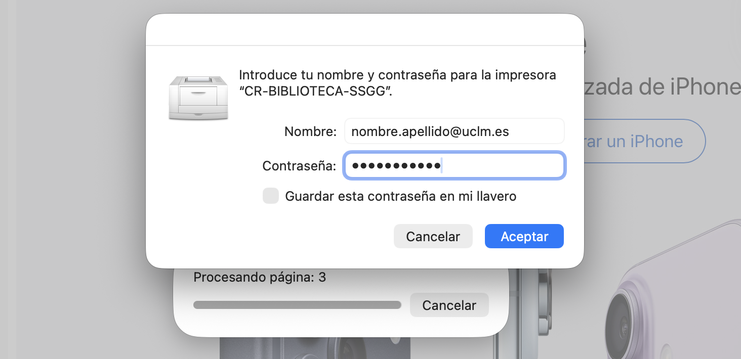 - A la hora de enviar el primer documento a imprimir a cada cola virtual, macOS te pedirá el usuario y contraseña de la UCLM (el correo electrónico completo, con @uclm.es) para conectarte a ella. Puedes guardar la contraseña en el llavero de macOS marcando la opción inferior para que no la vuelva a pedir.