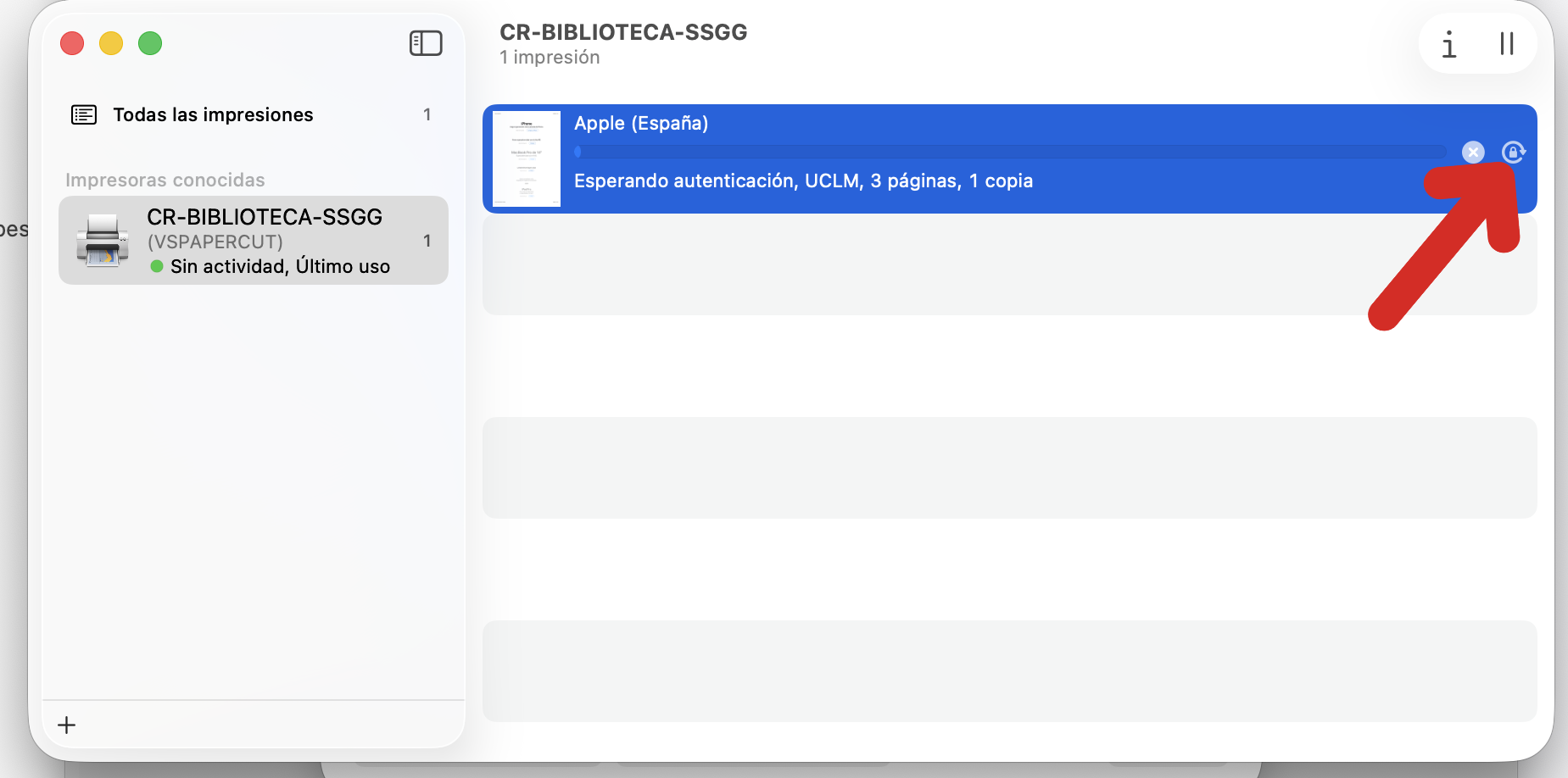- Si posteriormente cambias la contraseña de la cuenta de la UCLM, o cometes algún error en el paso anterior, puedes corregir el usuario y/o contraseña enviando un documento a imprimir (en el estado dirá que está esperando autenticación) y yendo a Ajustes del sistema, Impresoras y escáneres. Luego elige la impresora, pincha en Cola de impresión y en la lista de trabajos, haz clic en el icono del candado, a la derecha del todo e introduce el usuario y contraseña (correo completo de la UCLM).