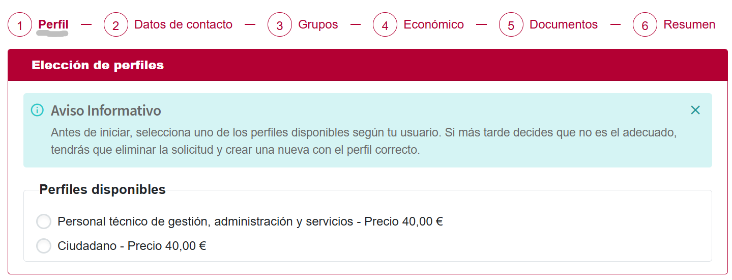 Si pertenece a más de un colectivo para los que se oferta la actividad, le aparecerá para seleccionar el perfil con el que quiere realizar la solicitud.