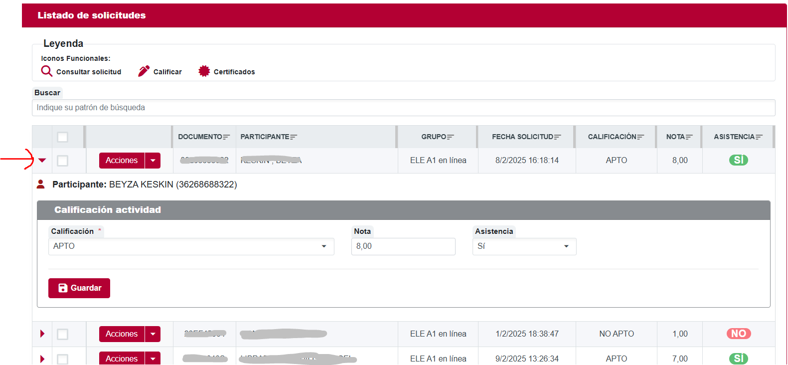 Por cada solicitud calificada pulse el botón guardar. Si la categoría a la que pertenece la actividad requiere que se califique con nota numérica, el campo "Nota" es obligatorio.