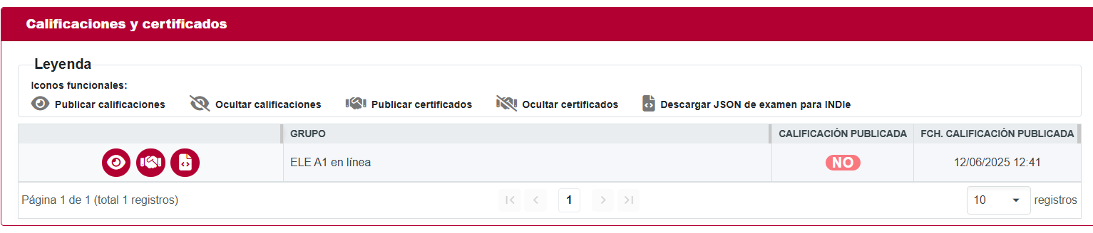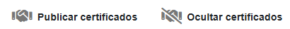 Dependiendo de la categoría a la que pertenece la actividad es necesario publicar los certificados para que los interesados puedan descargarlos desde la Sede electrónica, una vez que se hayan publicado las calificaciones. En estos casos, en el apartado superior de la pantalla se encuentra la opción de "Calificaciones y certificados publicados" con la opción "Publicar certificados" y "Ocultar certificados".