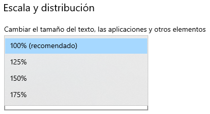 Para solucionar este incompatibilidad, pulse con el botón derecho en el escritorio de Windows, selecciona la opción de menú Configuración de pantalla y en la sección 'Escala y distribución' establezca el valor recomendado.