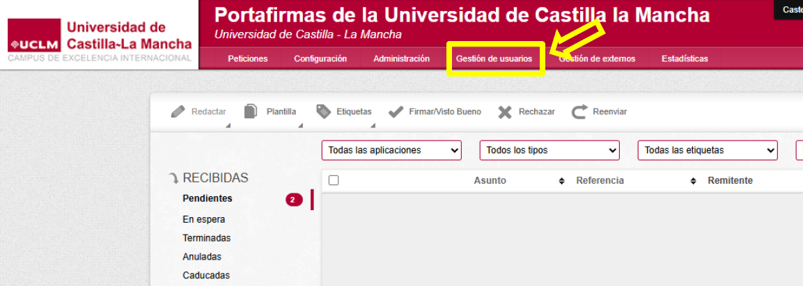 En las peticiones de firma se puede incluir como destinatarios, además de a usuarios de la UCLM, a usuarios externos para que participen en dicho proceso. Estos usuarios externos no están dados de alta en el Portafirmas por lo que, como paso previo, habrá que gestionar de forma manual el alta para que puedan acceder a la aplicación.