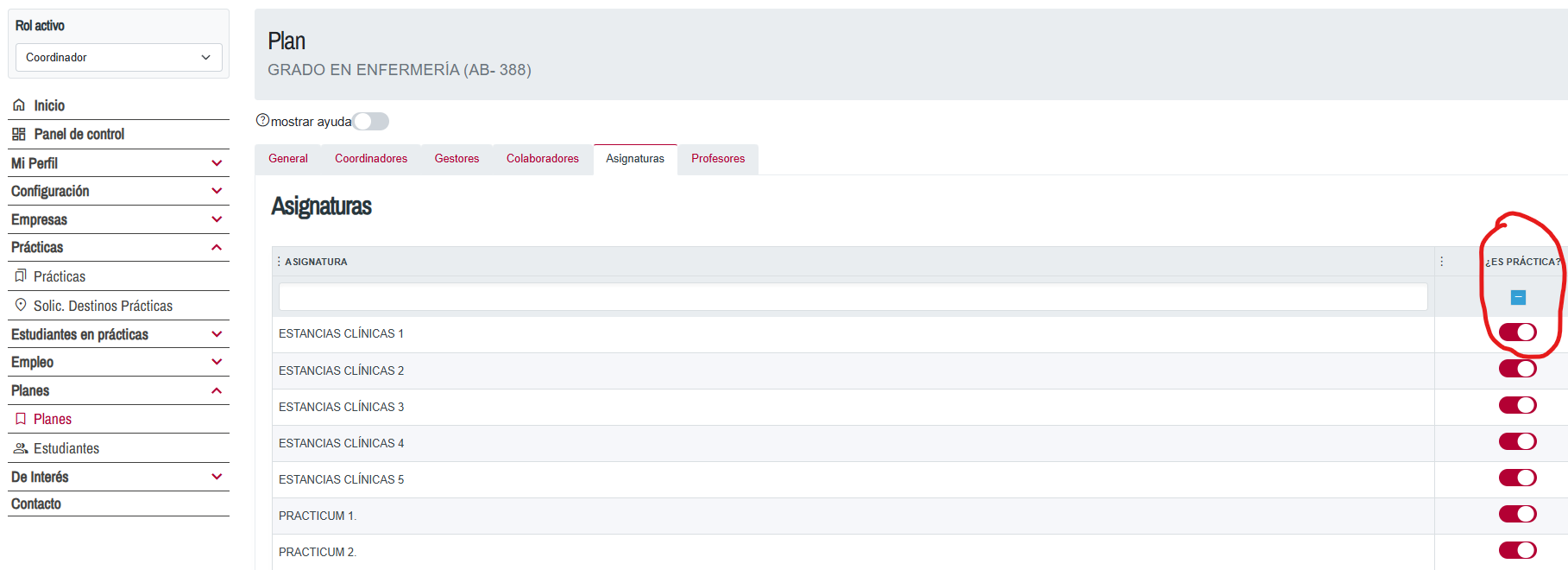 La funcionalidad para indicar que una asignatura incluye prácticas está restringida exclusivamente a los coordinadores de prácticas. Son ellos quienes tienen acceso al menú Planes > Asignaturas y pueden activar esta opción en la aplicación.