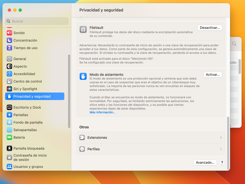 Deberá acceder al menú de ajustes del sistema, seleccionar "privacidad y seguridad". Dentro de esta sección, busque la opción Perfiles.