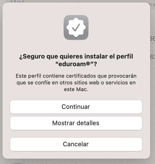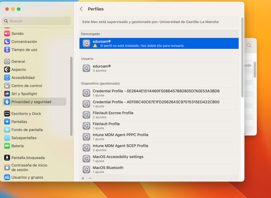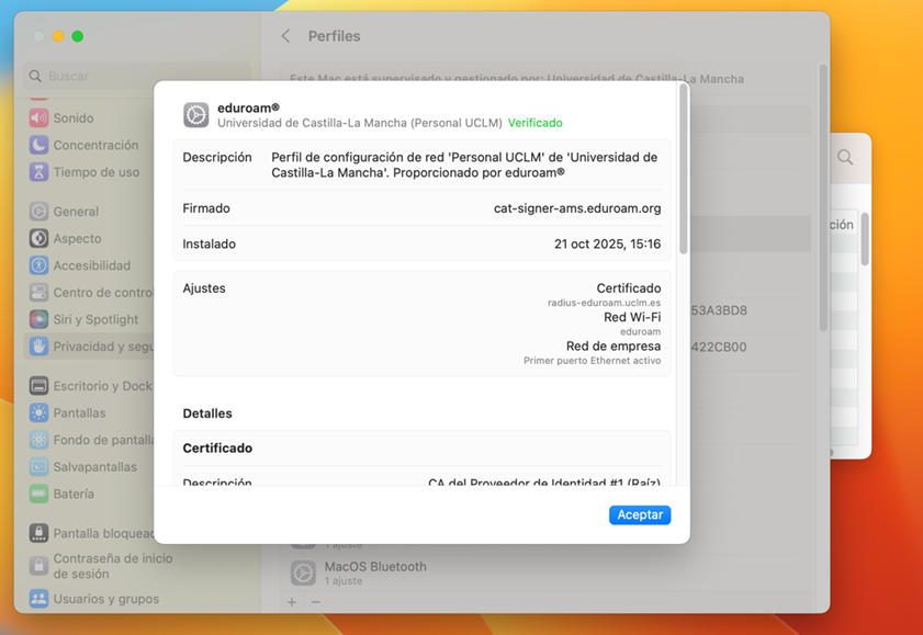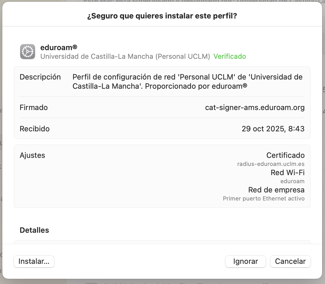 Cuando concluya la instalación, podrá ver su perfil de Eduroam instalado.