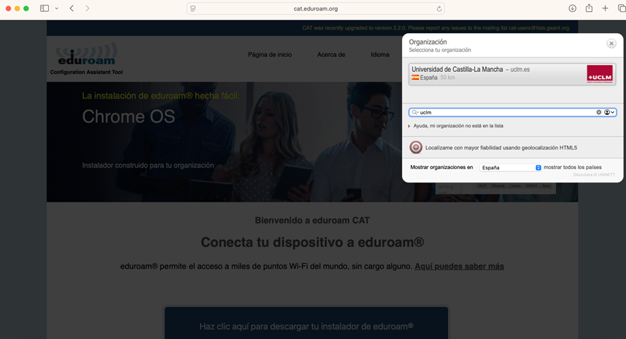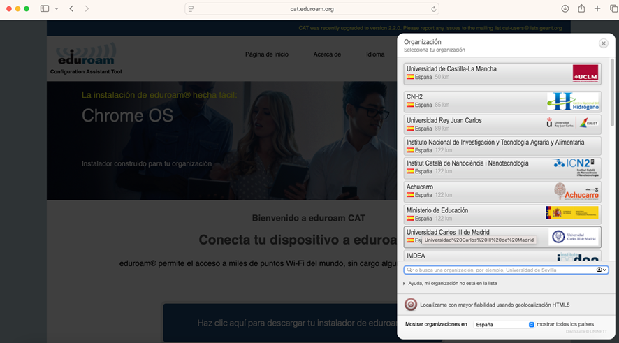 Deberá pulsar el botón "Haz clic aquí para descargar tu instalador de eduroam". Se abrirá una ventana para seleccionar nuestra organización.
