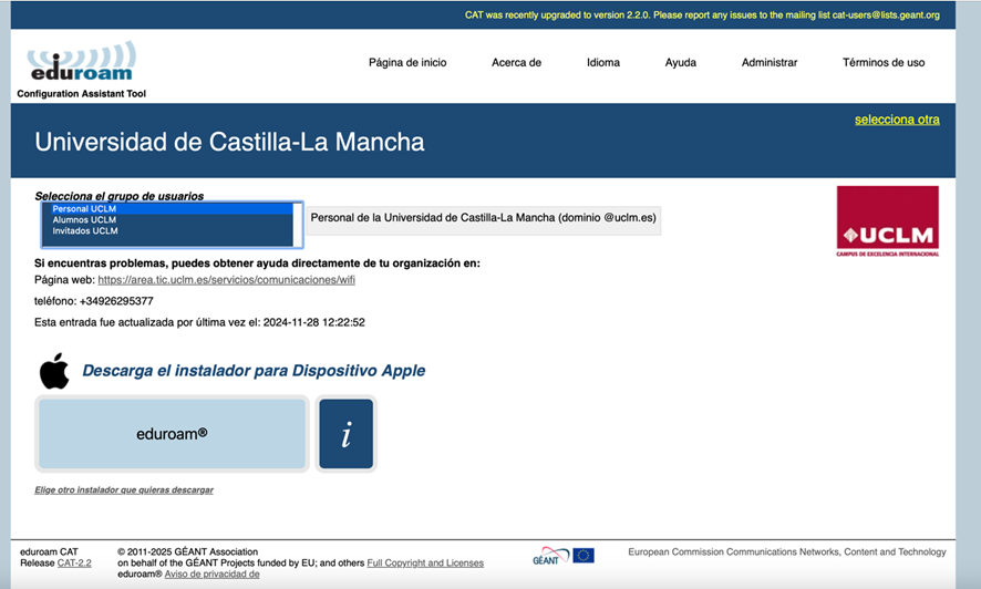 Seleccione el colectivo al que pertenece: Personal UCLM, Alumnos UCLM o Invitados UCLM y pulse el botón "eduroam®" para descargar el instalador para dispositivos Apple.