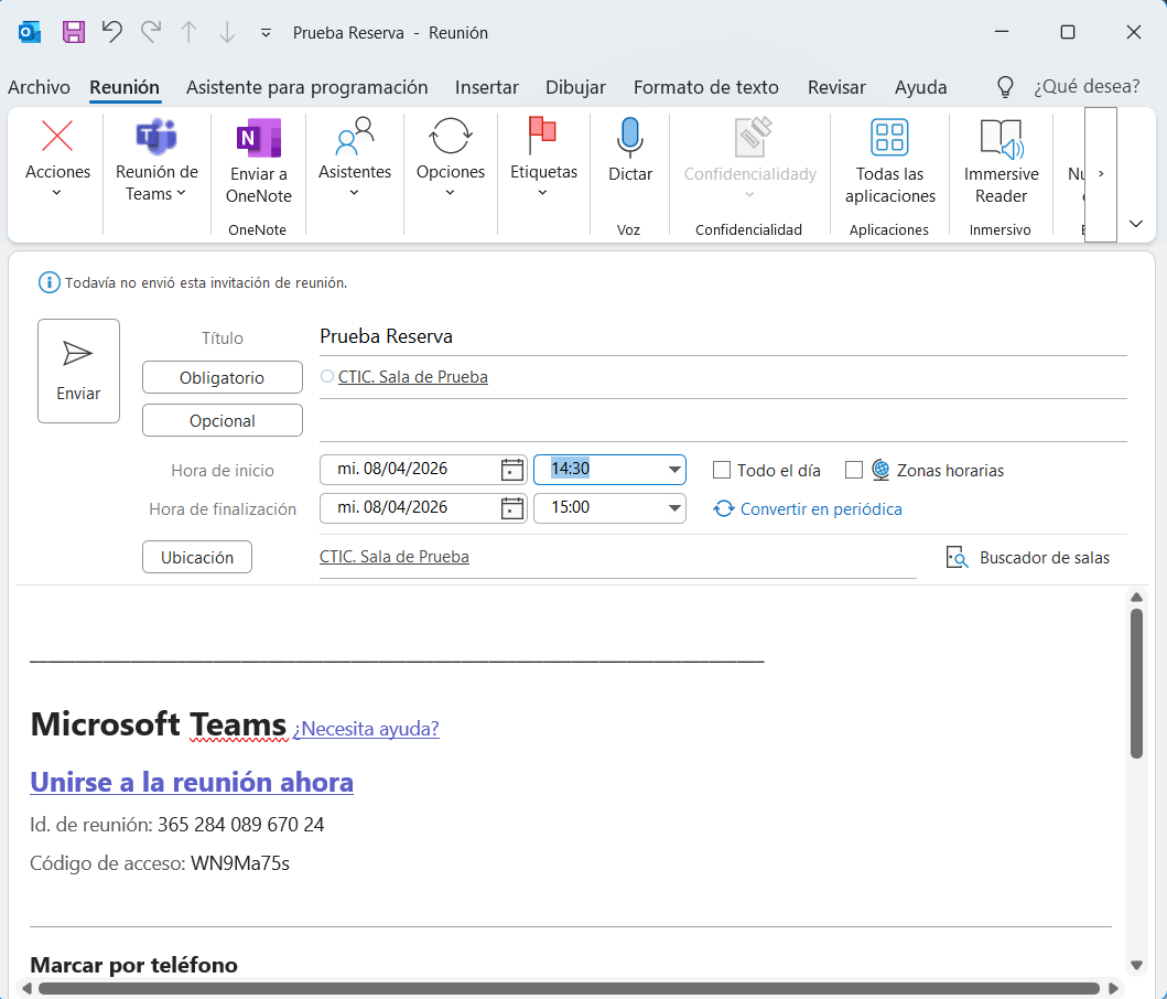 En el campo Ubicación, escribe el nombre de la sala o haz clic en el Buscador de salas si está disponible
