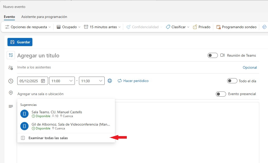 Para Outlook Classic: "Explorar con el buscador de salas".