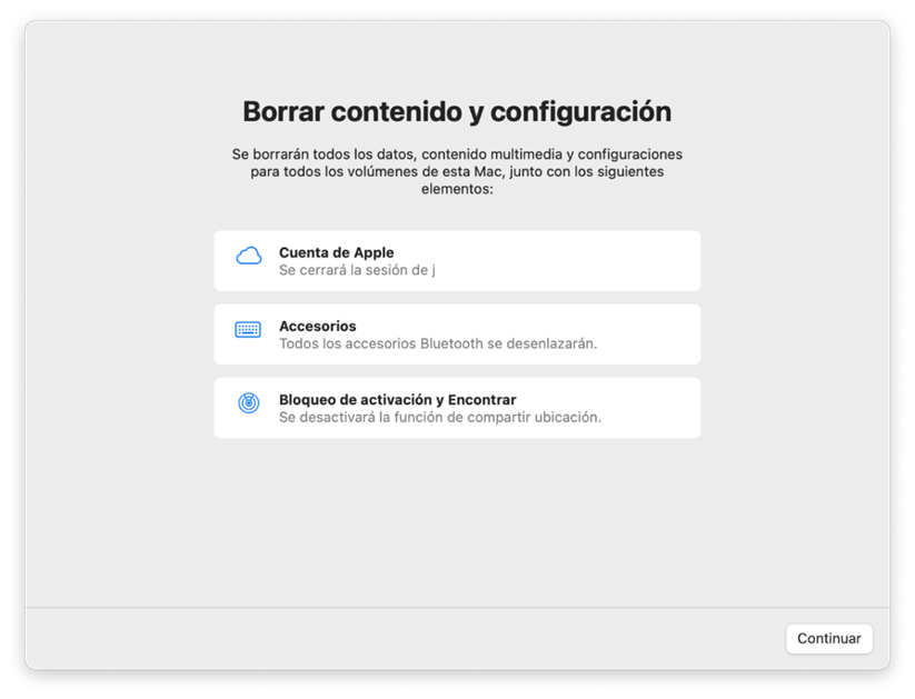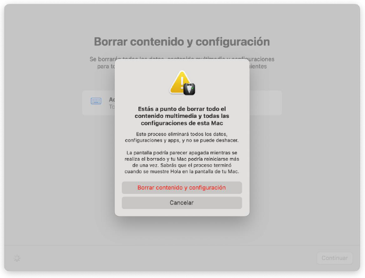 6. Y pulsaremos en borrar contenido y configuración. El proceso comenzará en un par de minutos. El equipo se reiniciará y se borrará todo su contenido. Es posible que el equipo se reinicie en un par de ocasiones.