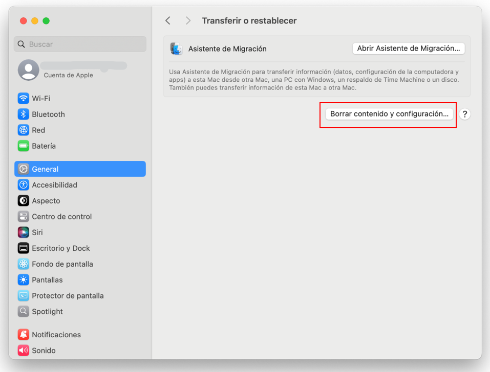 - Entramos en ajustes del sistema, general, transferir o restablecer y pulsamos en el botón borrar contenidos y ajustes… Como podemos ver en la captura, eliminará la cuenta de Apple, los accesorios y el bloqueo de activación y encontrar.