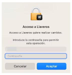 2. Nos pedirá la contraseña de administrador para el acceso a llaveros.