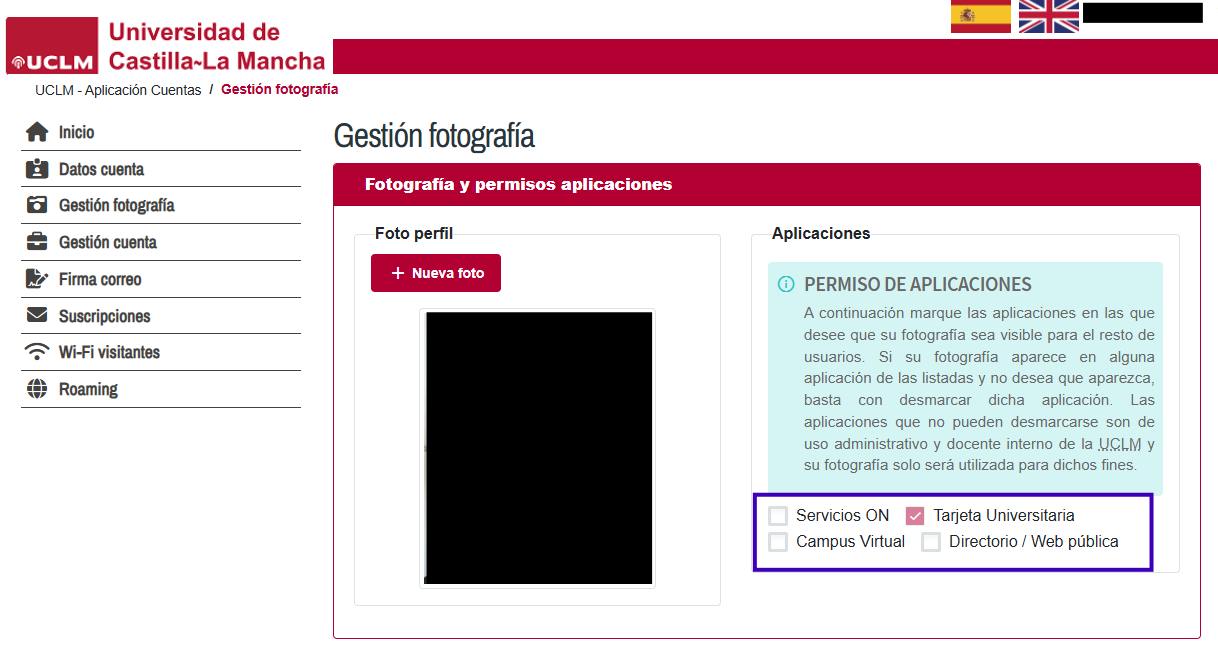 - Para mostrar tu foto, marca la casilla correspondiente a la aplicación (por ejemplo, Campus Virtual).