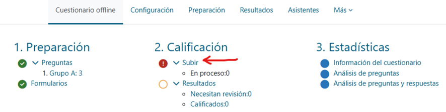 El mismo PDF que recibimos el correo con el conjunto de hojas de respuesta escaneadas, se puede subir al curso de Campus Virtual en la opción de ‘Subir’ en la parte de ‘Calificación’ del cuestionario Offline: